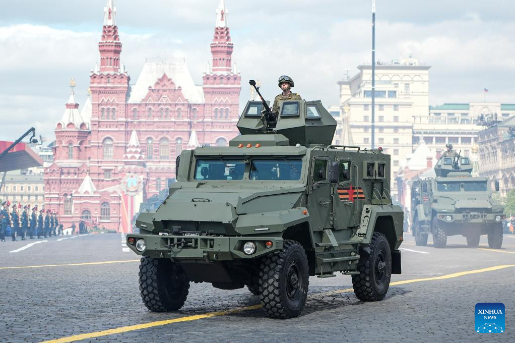Armored vehicles march during a grand parade marking the 80th anniversary of the victory in the Soviet Union's Great Patriotic War in Moscow, Russia, May 9, 2025. (Xinhua/Bai Xueqi)