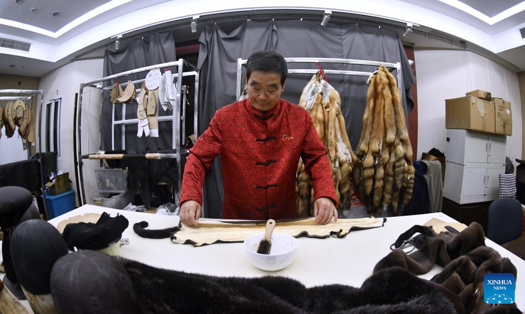 Li Jinshan, an inheritor of Shengxifu hat making technique, folds a hide at a Shengxifu workshop in Beijing, capital of China, April 22, 2025.