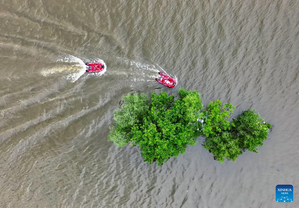 An aerial drone photo shows rescuers conducting a drill navigating speedboats to save individuals trapped on isolated islands in the river in Jindong District of Jinhua City, east China's Zhejiang Province, May 9, 2025. China observes the National Disaster Prevention and Reduction Day on May 12 each year. Various publicity, drill and training activities are carried out across China to improve public awareness in scientific disaster prevention and self-rescue. (Photo by Shi Kuanbing/Xinhua)