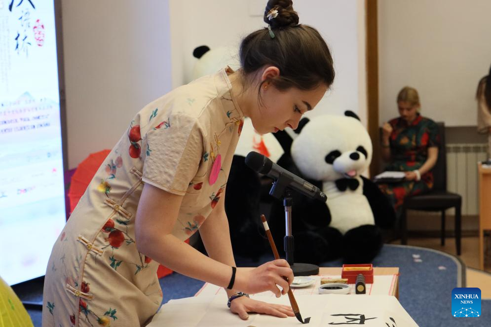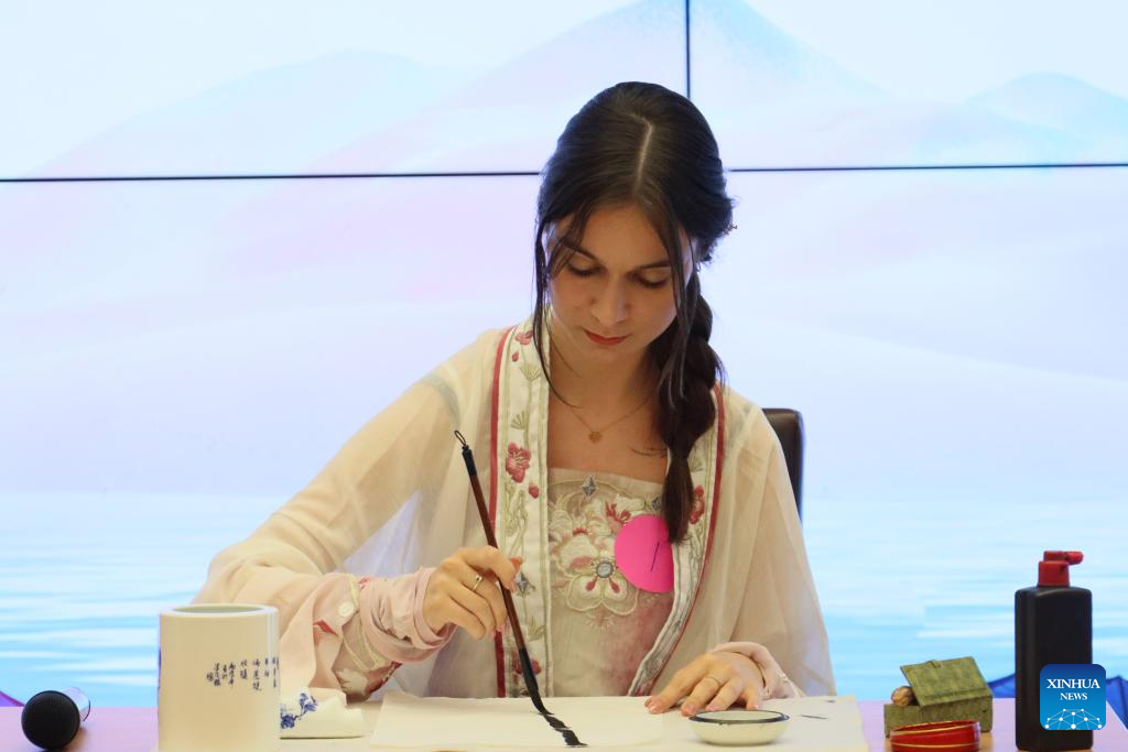 A competitor writes calligraphy during the 24th "Chinese Bridge" Chinese Proficiency Competition for College Students in Cluj-Napoca, Romania, May 10, 2023. The Romanian division finals of the 24th "Chinese Bridge" Chinese Proficiency Competition for College Students was held here on Saturday. (Photo by Lu Jicheng/Xinhua)