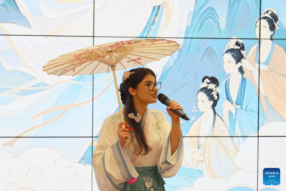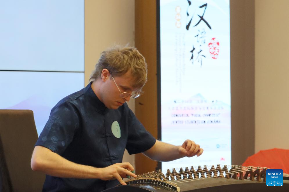 A competitor performs during the 24th "Chinese Bridge" Chinese Proficiency Competition for College Students in Cluj-Napoca, Romania, May 10, 2023. The Romanian division finals of the 24th "Chinese Bridge" Chinese Proficiency Competition for College Students was held here on Saturday. (Photo by Lu Jicheng/Xinhua)
