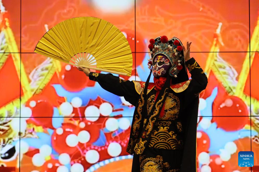 A volunteer teacher of Confucius Institute performs Bianlian, or face-changing, a part of the Sichuan opera, during the 24th "Chinese Bridge" Chinese Proficiency Competition for College Students in Cluj-Napoca, Romania, May 10, 2023. The Romanian division finals of the 24th "Chinese Bridge" Chinese Proficiency Competition for College Students was held here on Saturday. (Photo by Lu Jicheng/Xinhua)