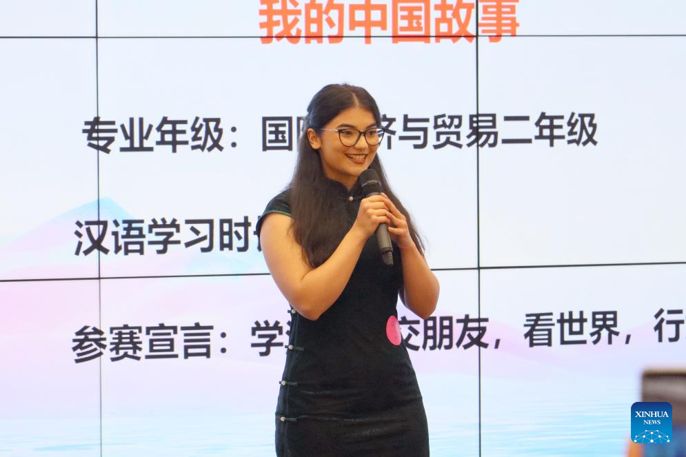 A competitor delivers a speech during the 24th "Chinese Bridge" Chinese Proficiency Competition for College Students in Cluj-Napoca, Romania, May 10, 2023. The Romanian division finals of the 24th "Chinese Bridge" Chinese Proficiency Competition for College Students was held here on Saturday. (Photo by Lu Jicheng/Xinhua)