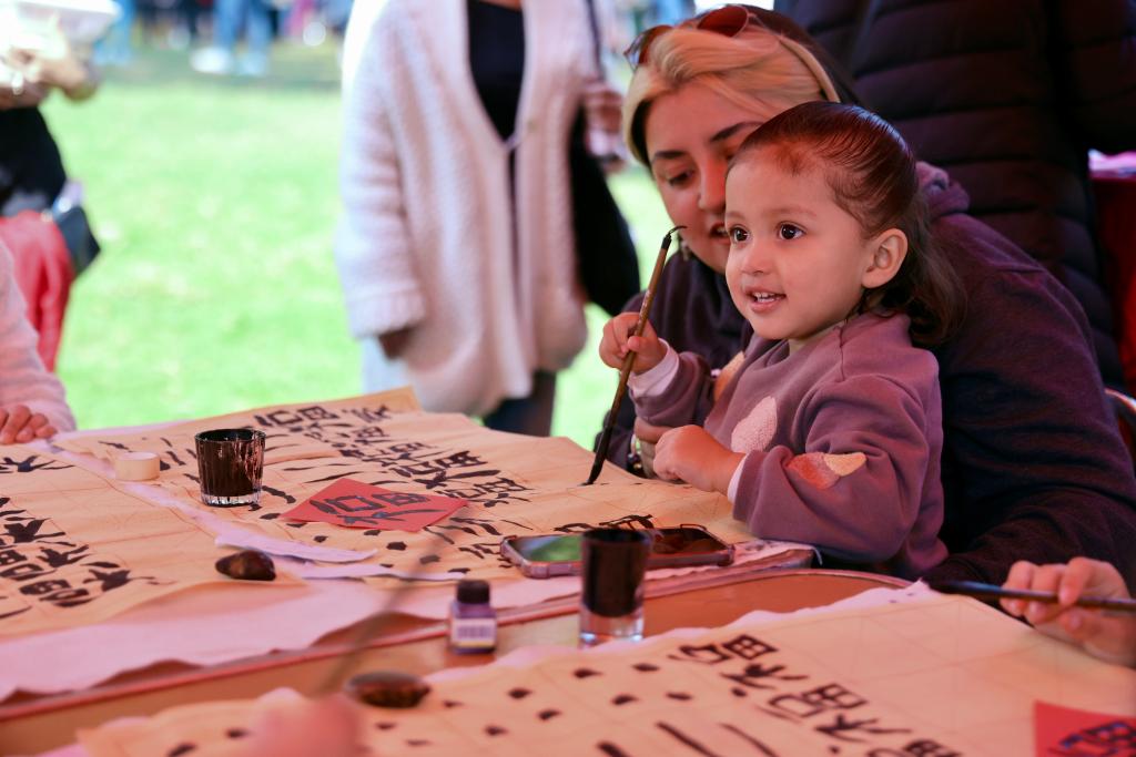 A girl learns Chinese calligraphy at the 4th edition of the Chinese New Year cultural festival at the National Arts Center in Mexico City, capital of Mexico, Jan. 25, 2025. (Xinhua/Li Mengxin)