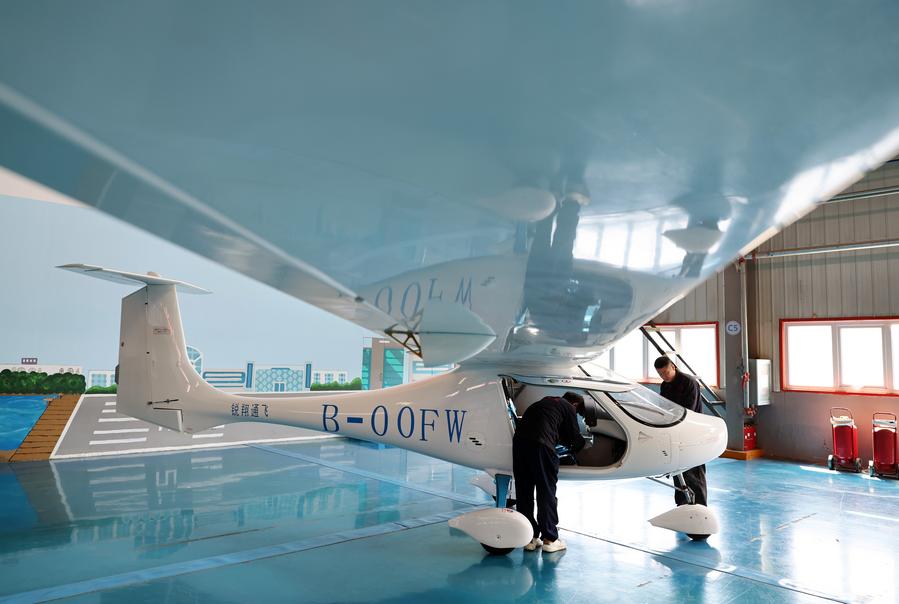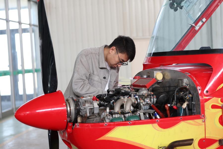 A staff member of Liaoning Zhongzhi Yisheng Aviation Flight Academy maintains a light sport aircraft in Faku County, in Shenyang, northeast China's Liaoning Province, April 25, 2025. (Xinhua/Yang Qing)