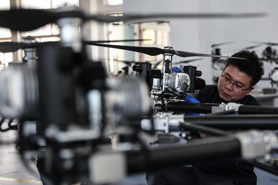 An engineer assembles an unmanned helicopter at a workshop of Faku Zhong Jun Yi UAV Technology Co., Ltd. in Faku County, in Shenyang, northeast China's Liaoning Province, April 25, 2025. (Xinhua/Pan Yulong)