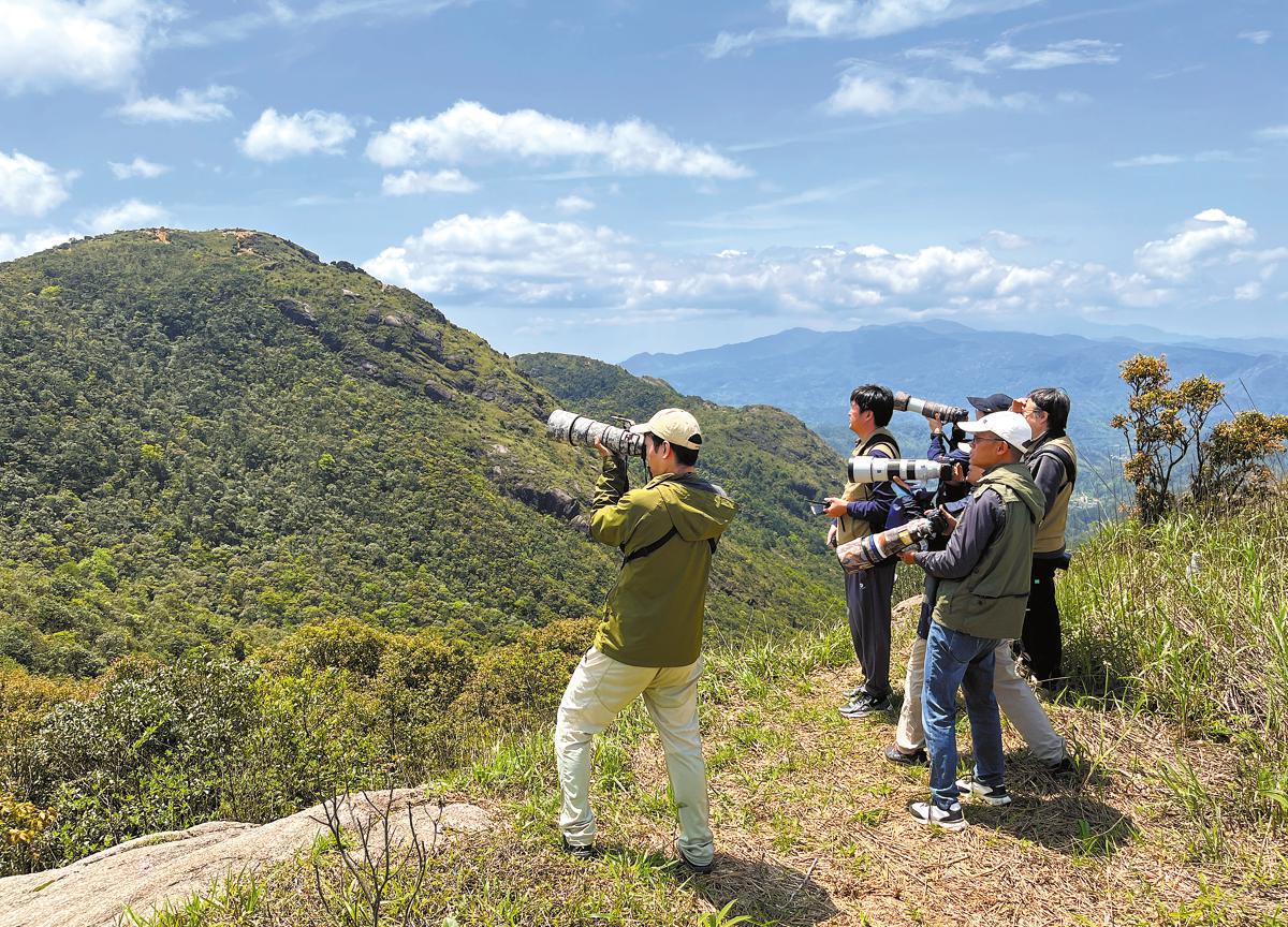 Two teams of the carnival's participants watch birds from a peak straddling Guangdong and Hunan provinces on April 28. ZHANG SIMING/FOR CHINA DAILY