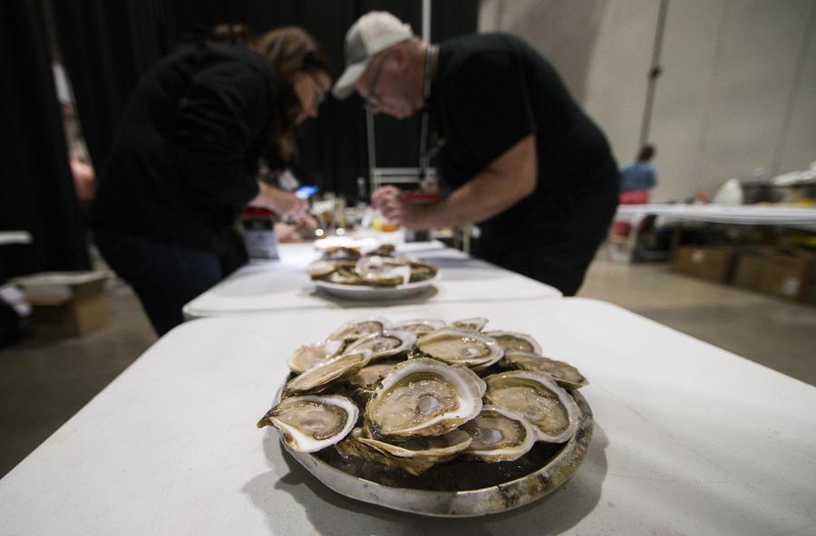 Judges check oysters after being shucked during John Bil Oyster Shucking Competition at the 2022 Restaurants Canada Show in Toronto, Canada, on May 11, 2022.(Photo by Zou Zheng/Xinhua)