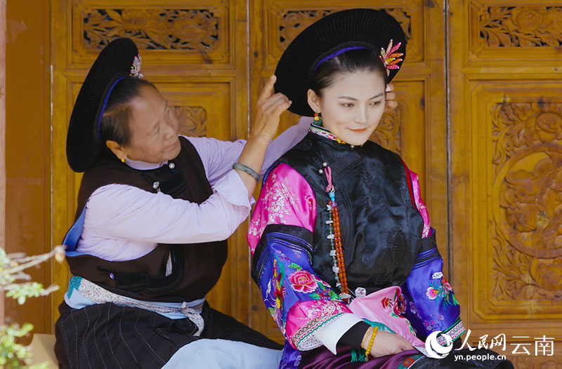A Bai ethnic woman adjusts an embroidered accessory on another woman in Diannan town, Heqing county, southwest China's Yunnan Province. (Photo/Jiang Ze)