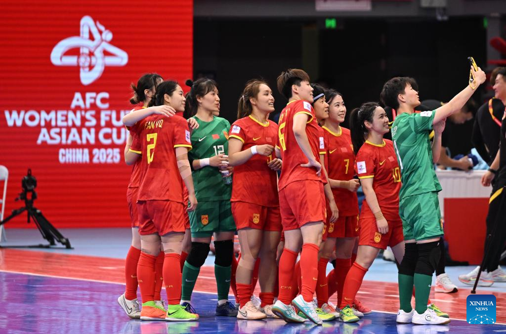 Players of China take selfies after the quarterfinal match between China and Indonesia at AFC Women's Futsal Asian Cup 2025 in Hohhot, north China's Inner Mongolia Autonomous Region, May 13, 2025. (Xinhua/Bei He)