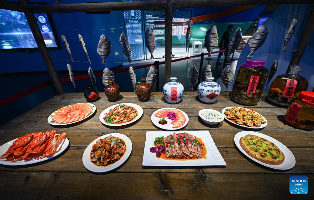 This photo taken on May 13, 2025 shows models of the Tanka people's cuisine displayed at Hainan Tanka Museum in Lingshui, south China's Hainan Province. (Xinhua/Pu Xiaoxu)