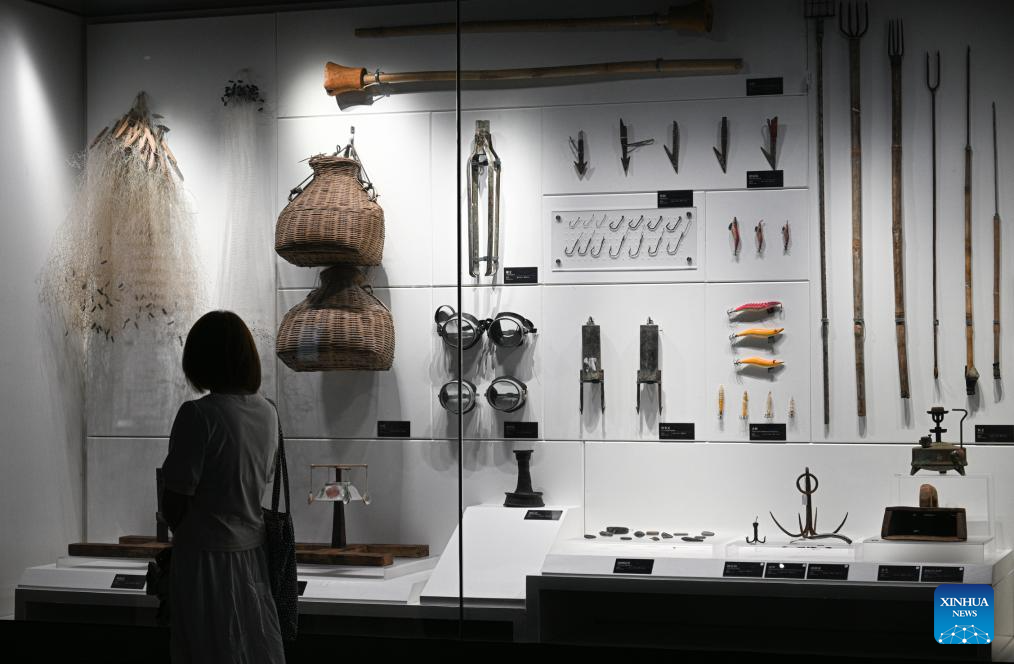 A visitor views production tools of the Tanka people at Hainan Tanka Museum in Lingshui, south China's Hainan Province, May 13, 2025. (Xinhua/Pu Xiaoxu)