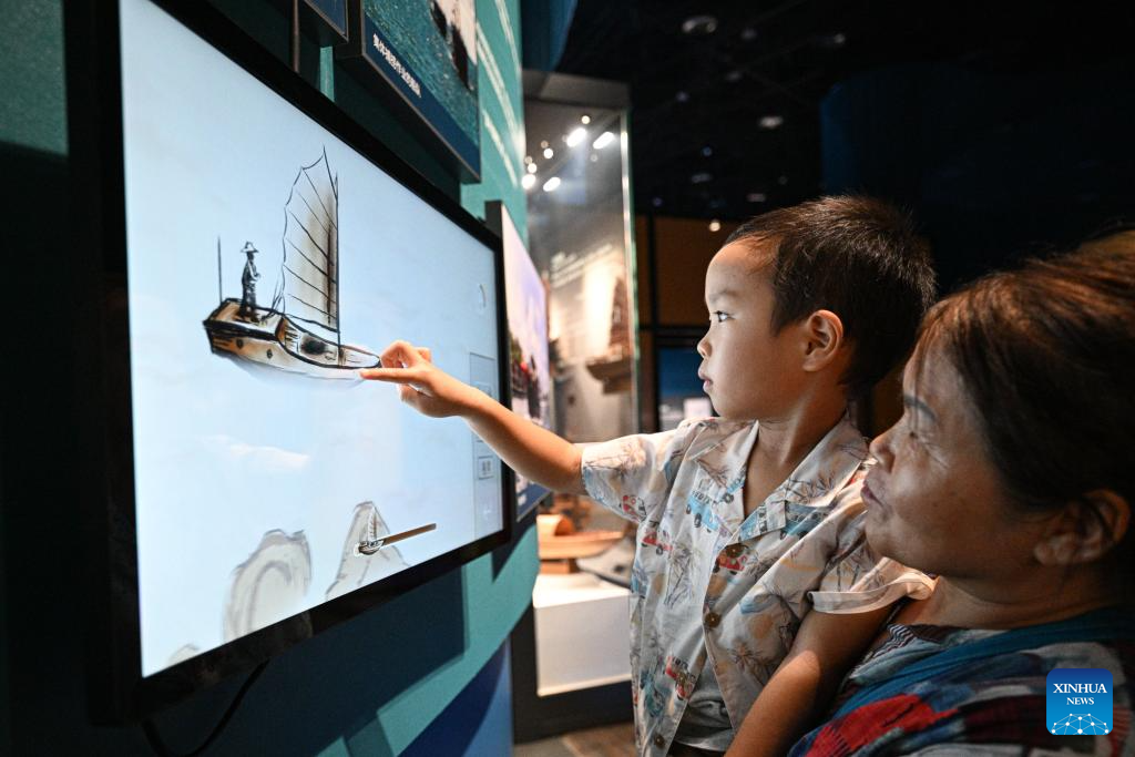 Visitors watch an animation showing the Tanka people going to the sea to collect pearls at Hainan Tanka Museum in Lingshui, south China's Hainan Province, May 13, 2025. (Xinhua/Pu Xiaoxu)