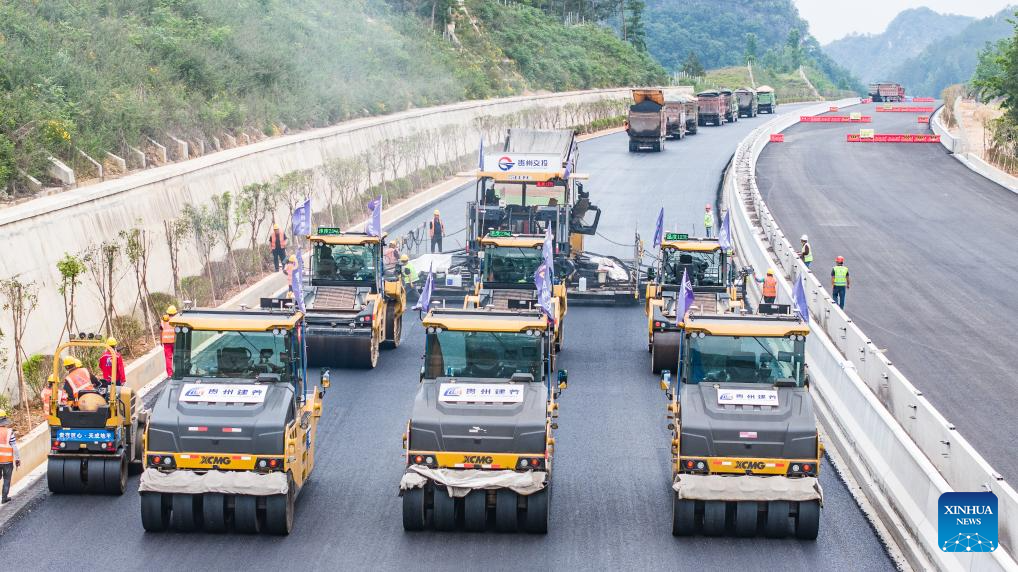An aerial drone photo taken on May 12, 2025 shows a section of the Guiyang-Pingtang expressway under construction in southwest China's Guizhou Province. With a designed speed of 100 km per hour, the Guiyang-Pingtang expressway in Guizhou has a total length of 174.018 km. According to the current progress of the project, the construction of the expressway is expected to be completed by the end of this year. (Xinhua/Tao Liang)