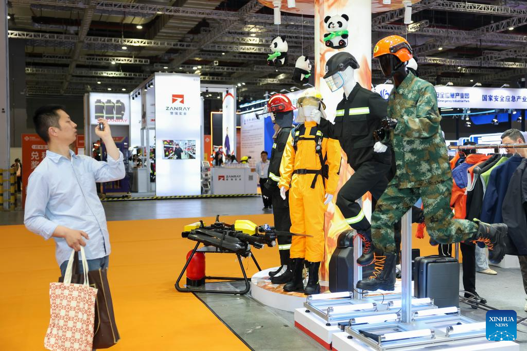 A visitor takes photos of the fire rescue outfits on display during the fourth Yangtze River Delta International Emergency Disaster Reduction and Rescue Expo in Shanghai, east China, May 13, 2025. Over 3,000 cutting-edge equipment and technologies are on display at the expo.