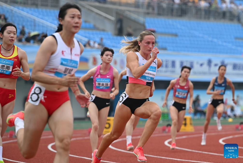 Kristie Edwards (C) of Australia competes during the women's 200m preliminary at the 3rd Belt and Road Athletics Invitational Meeting in southwest China's Chongqing, May 15, 2025. (Xinhua/Chen Cheng)