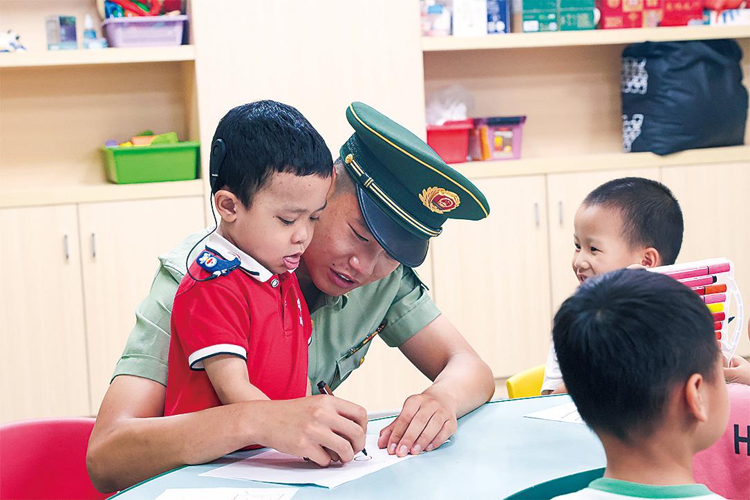 Soldiers from the Red Outpost Company interact with children with partial sight and hearing in Zhuhai in May last year. (Photo/China Daily)