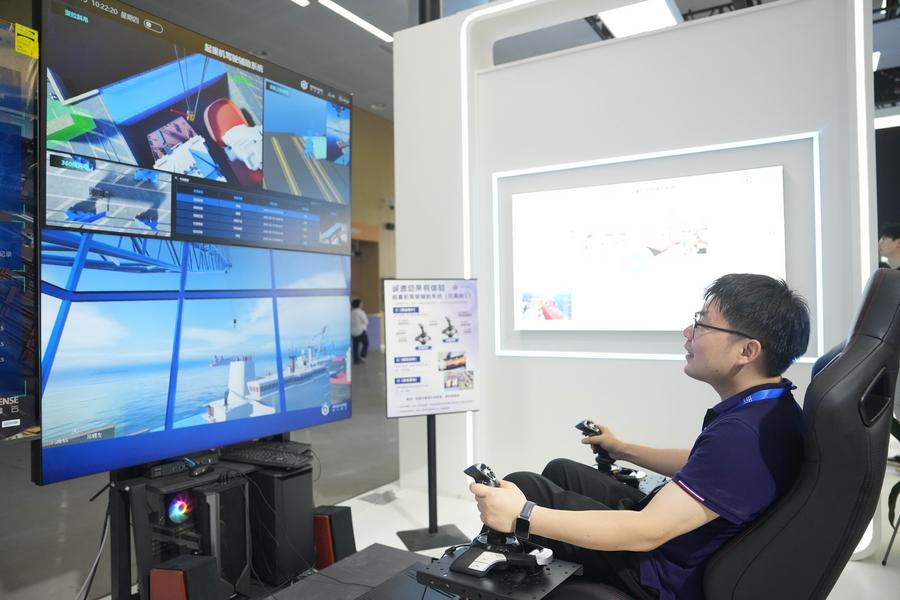 An exhibitor demonstrates an operating assistance system for cranes during the 4th Changsha International Construction Equipment Exhibition in Changsha, central China's Hunan Province, May 15, 2025. (Xinhua/Xue Yuge)