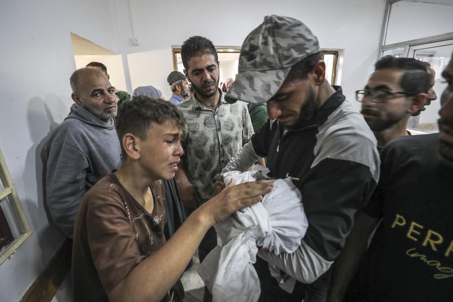 Palestinians mourn over a victim after an Israeli airstrike in the Jabalia refugee camp, northern Gaza Strip, May 14, 2025. (Photo by Mahmoud Zaki/Xinhua)