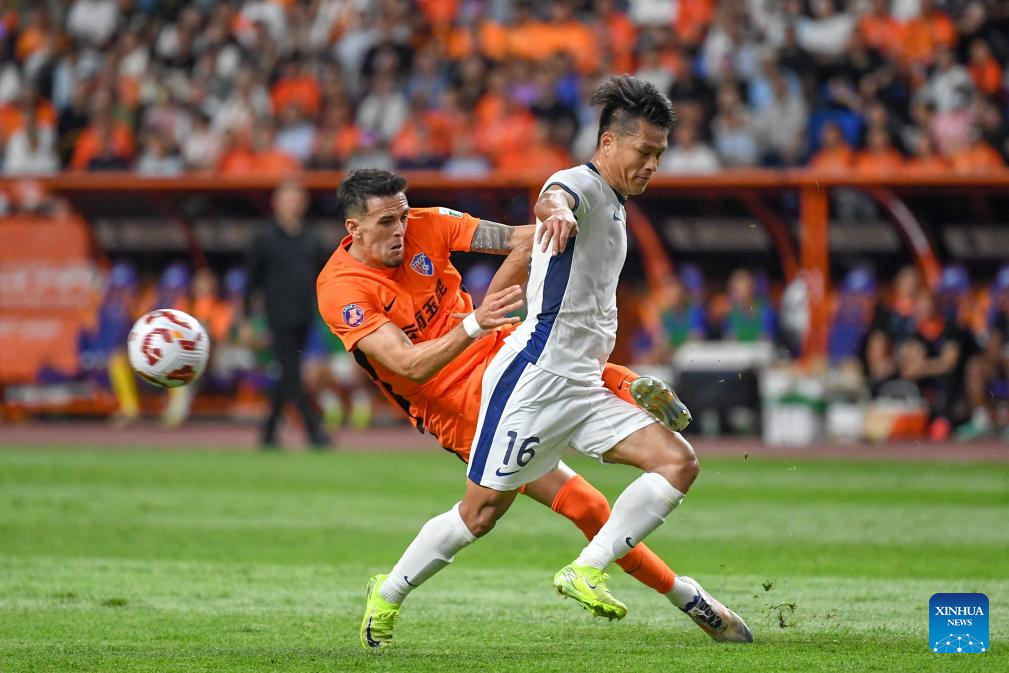 Jose Martinez (L) of Yunnan Yukun competes during the 13th round match between Yunnan Yukun and Meizhou Hakka at the 2025 season Chinese Football Super League (CSL) in Yuxi, southwest China's Yunnan Province, May 16, 2025. (Photo by Peng Yikai/Xinhua)