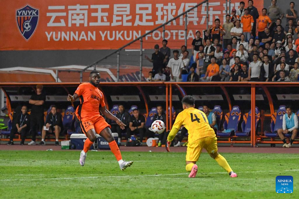 Oscar Maritu (front) of Yunnan Yukun competes during the 13th round match between Yunnan Yukun and Meizhou Hakka at the 2025 season Chinese Football Super League (CSL) in Yuxi, southwest China's Yunnan Province, May 16, 2025. (Photo by Peng Yikai/Xinhua)