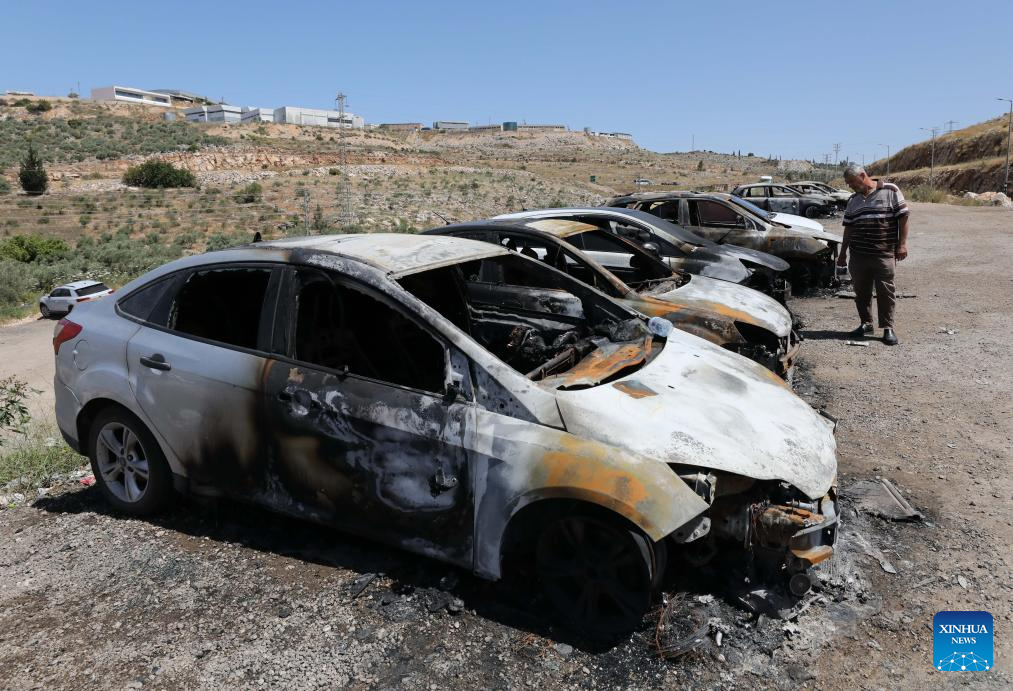 A Palestinian checks cars burned by Israeli settlers near the West Bank city of Salfit, May 16, 2025. (Photo by Nidal Eshtayeh/Xinhua)
