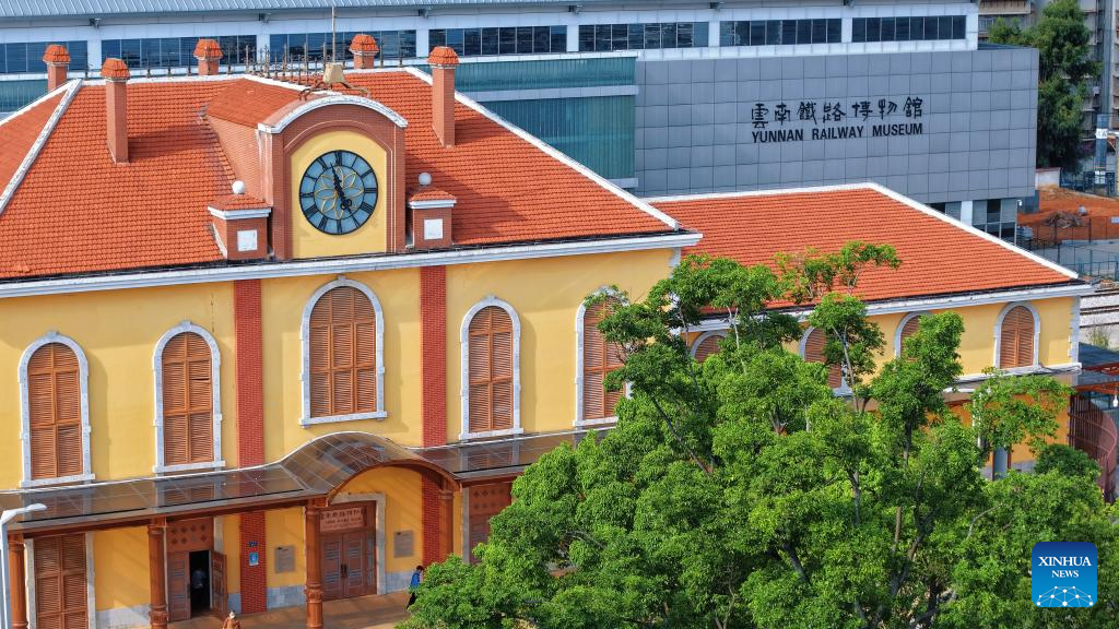 A drone photo shows an exterior view of Yunnan Railway Museum in Kunming, southwest China's Yunnan Province, May 14, 2025. Housed in Kunming North Railway Station, the Yunnan Railway Museum takes the century-long development history of Yunnan railway as the leading story line to narrate the frog-leaping evolution railway gauge standards from meter gauge to inch gauge, and standard gauge, as well as railway technologies from steam locomotives to high-speed rails. (Photo by Yang Zixuan/Xinhua)