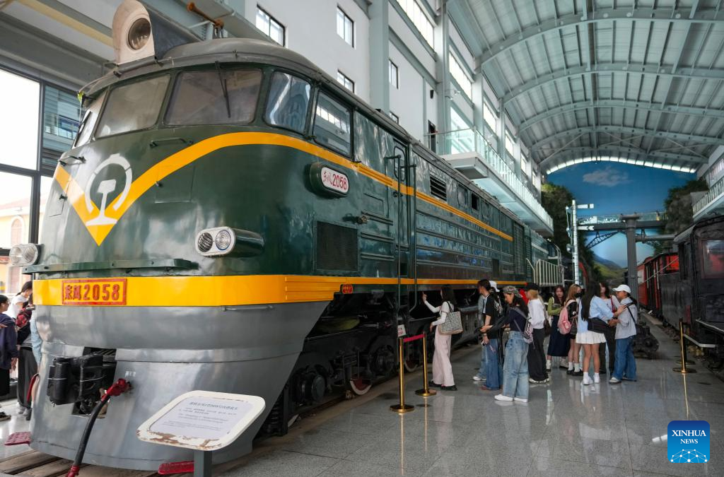 People visit Yunnan Railway Museum in Kunming, southwest China's Yunnan Province, May 14, 2025. Housed in Kunming North Railway Station, the Yunnan Railway Museum takes the century-long development history of Yunnan railway as the leading story line to narrate the frog-leaping evolution railway gauge standards from meter gauge to inch gauge, and standard gauge, as well as railway technologies from steam locomotives to high-speed rails. (Xinhua/Chen Xinbo)