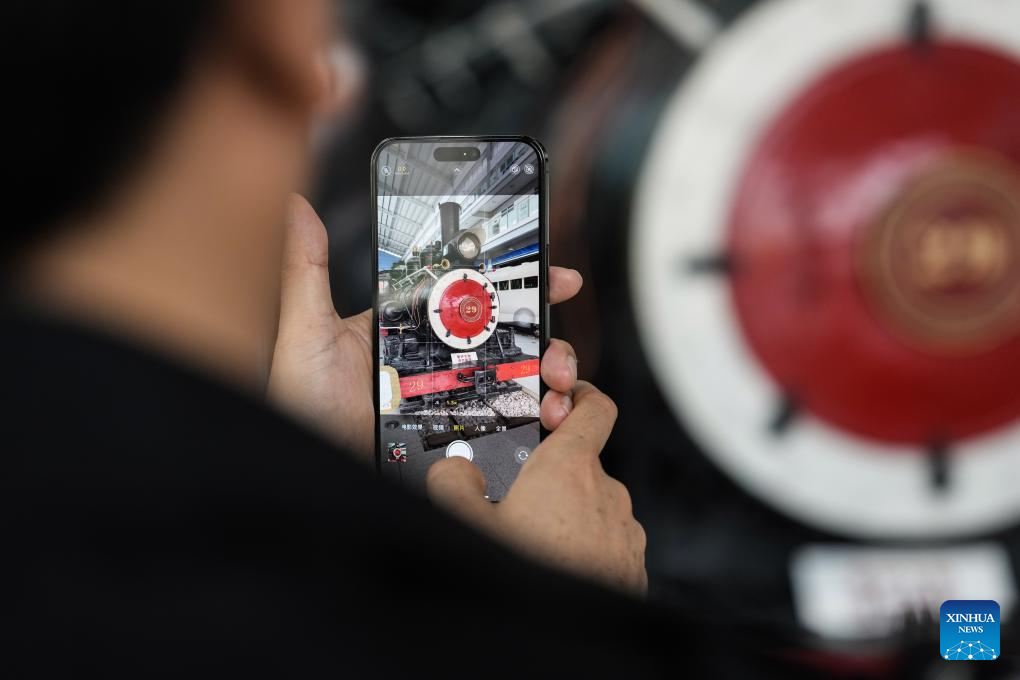 A visitor takes photos of a steam locomotive at Yunnan Railway Museum in Kunming, southwest China's Yunnan Province, May 14, 2025. Housed in Kunming North Railway Station, the Yunnan Railway Museum takes the century-long development history of Yunnan railway as the leading story line to narrate the frog-leaping evolution railway gauge standards from meter gauge to inch gauge, and standard gauge, as well as railway technologies from steam locomotives to high-speed rails. (Xinhua/Chen Xinbo)