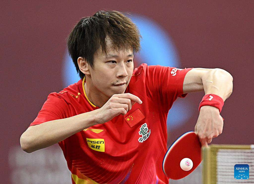 Lin Shidong hits a return during the men's singles round of 128 match between Lin Shidong of China and Liam Pitchford of England at ITTF World Table Tennis Championships Finals Doha 2025 in Doha, Qatar, May 18, 2025. (Xinhua/Liu Xu)