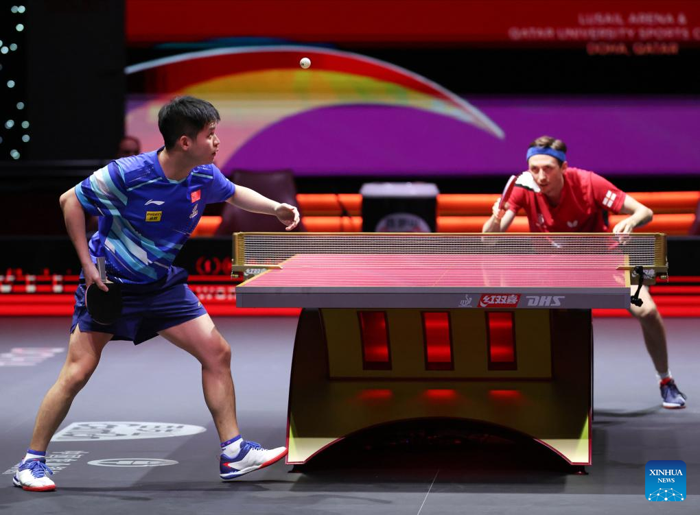 Lin Shidong competes during the men's singles round of 128 match between Lin Shidong of China and Liam Pitchford of England at ITTF World Table Tennis Championships Finals Doha 2025 in Doha, Qatar, May 18, 2025. (Xinhua/Liu Xu)