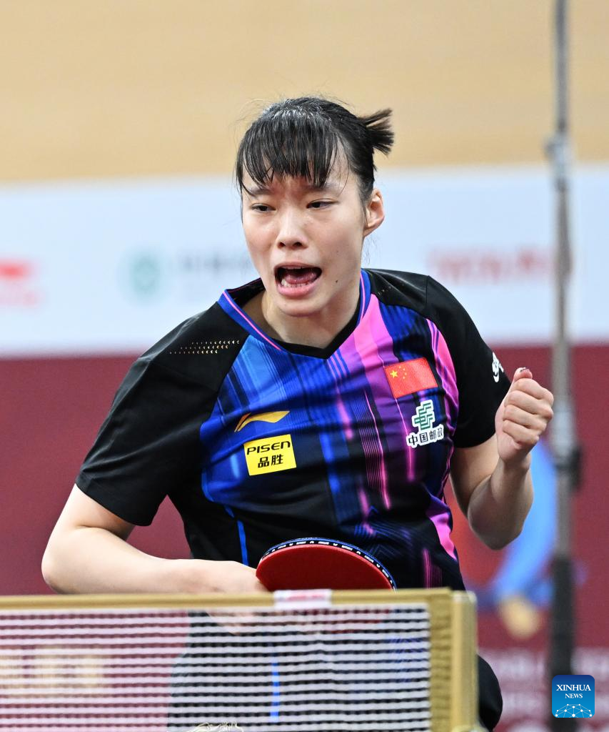 Shi Xunyao competes during the women's singles round of 128 match between Shi Xunyao of China and Lam Yee Lok of China's Hongkong at ITTF World Table Tennis Championships Finals Doha 2025 in Doha, Qatar, May 18, 2025. (Xinhua/He Changshan)