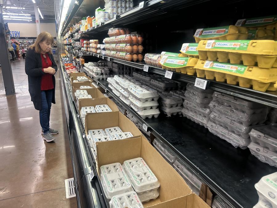 This photo taken with a mobile phone on Feb. 7, 2025 shows a customer shopping for eggs at a Walmart in El Monte, Los Angeles County, California, the United States. (Photo by Zeng Hui/Xinhua)