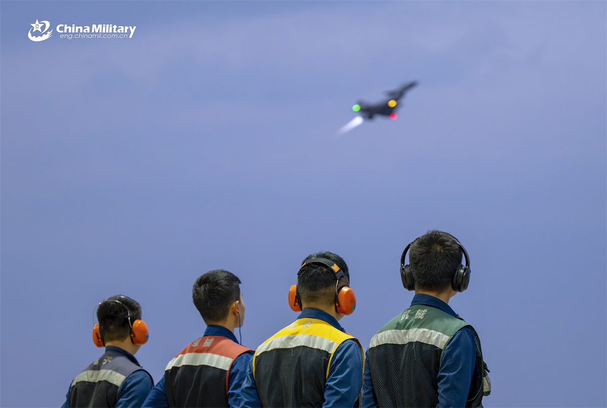 Maintenance men assigned to an aviation brigade of the air force under the Chinese PLA Southern Theater Command and a J-10 fighter jet are captured in the same frame during a day-and-night flight training exercise. (eng.chinamil.com.cn/Shang Jieyan)