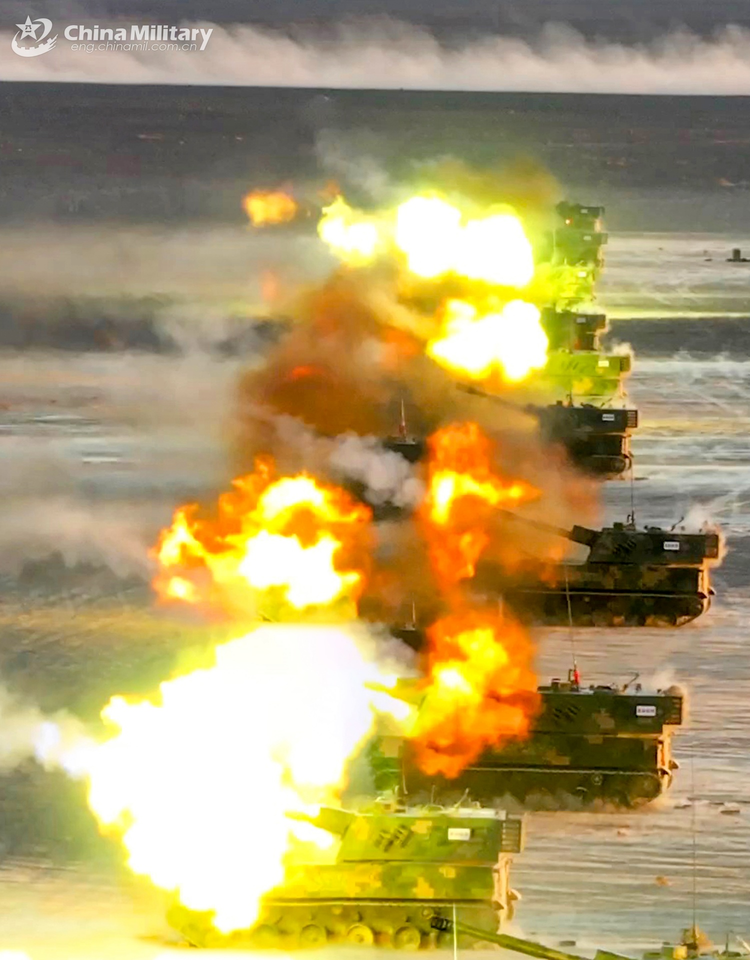 PLZ-07 122mm self-propelled howitzer systems attached to an artillery detachment of a brigade with the army under the Chinese PLA Eastern Theater Command fire at mock targets during a live-fire training exercise in early May 2025. (eng.chinamil.com.cn/Zhang Mao)