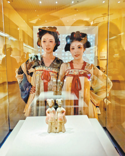 Tourists pose for a picture with figurines featuring two painted pottery females holding hands at the Luoyang Museum in central China's Henan Province. (Photo/Yang Yanfei)