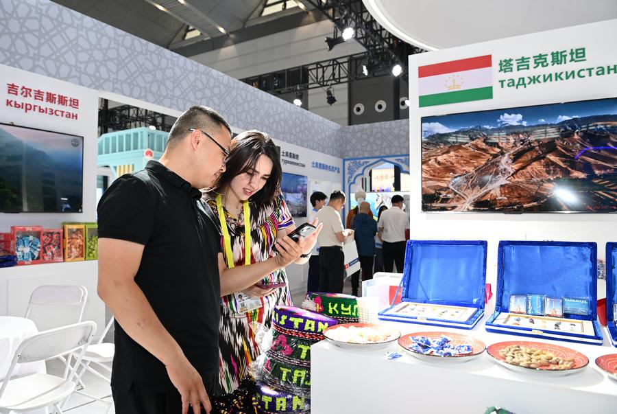 Visitors learn about Tajik products during the 9th Silk Road International Exposition and the Investment and Trade Forum for Cooperation between East & West China in Xi'an, northwest China's Shaanxi Province, May 21, 2025. (Xinhua/Li Yibo)