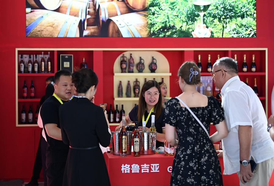 Visitors learn about Georgian products during the 9th Silk Road International Exposition and the Investment and Trade Forum for Cooperation between East & West China in Xi'an, northwest China's Shaanxi Province, May 21, 2025. (Xinhua/Li Yibo)