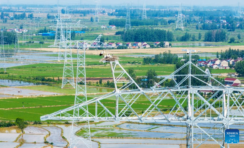 An oriental white stork perches on top of a transmission tower in Huoqiu County, east China's Anhui Province, May 20, 2025. In early May this year, workers discovered a nest of oriental white stork, a migratory bird under first-class state protection, on the newly-built transmission tower. The State Grid Anhui Electric Power Co., Ltd. has installed high-definition cameras near the nest, assigned designated staff to track and protect the oriental white storks, and postponed the construction progress according to the breeding timeline of the storks. (Xinhua/Zhou Mu)
