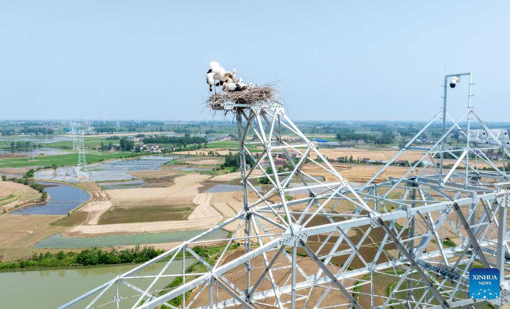 An aerial drone photo taken on May 21, 2025 shows oriental white storks taking care of the nestlings on top of a transmission tower in Huoqiu County, east China's Anhui Province. In early May this year, workers discovered a nest of oriental white stork, a migratory bird under first-class state protection, on the newly-built transmission tower. The State Grid Anhui Electric Power Co., Ltd. has installed high-definition cameras near the nest, assigned designated staff to track and protect the oriental white storks, and postponed the construction progress according to the breeding timeline of the storks. (Xinhua/Zhou Mu)