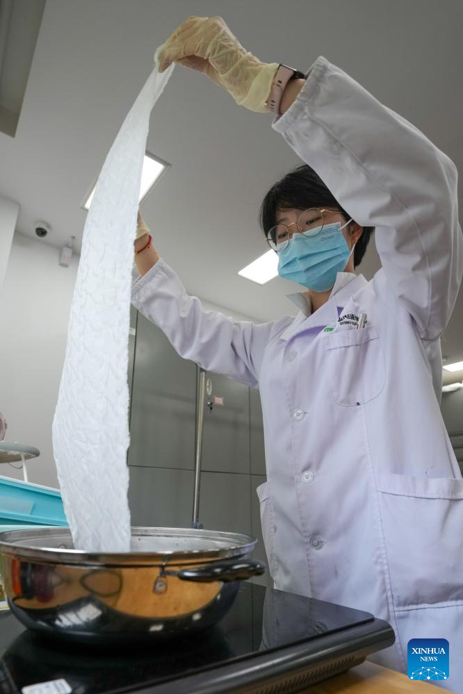 Suzhou Silk Museum staff member Chen Yanlu prepares dyes for silk garment restoration in Suzhou, east China's Jiangsu Province, May 18, 2025. (Xinhua/Chen Shuo)
