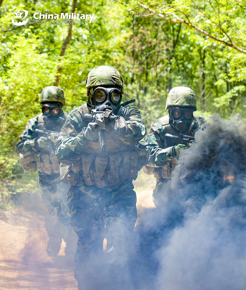 Soldiers assigned to a brigade under the Chinese PLA 71st Group Army pass through the contaminated area in combat formation during an emergency chemical defense training exercise on May 14, 2025. (eng.chinamil.com.cn/Photo by Lin Weihong and Jiang Yucheng)