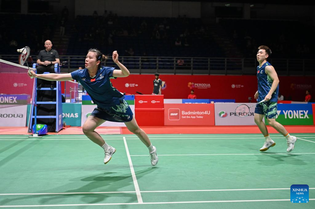 Guo Xinwa (R)/Chen Fanghui of China compete during the mixed doubles round of 16 match against Dejan Ferdinansyah/Siti Fadia Silva Ramadhanti of Indonesia at 2025 Malaysia Masters badminton tournament in Kuala Lumpur, Malaysia, May 22, 2025. (Photo by Chong Voon Chung/Xinhua)