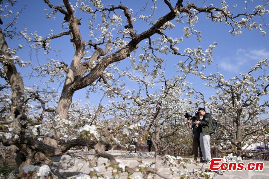 File photo taken on April 10, 2024 shows visitors take photos of blooming pear flowers at the Gaolan Shichuan Ancient Pear Orchard System in Lanzhou City, northwest China's Gansu Province. (Photo/China News Service)