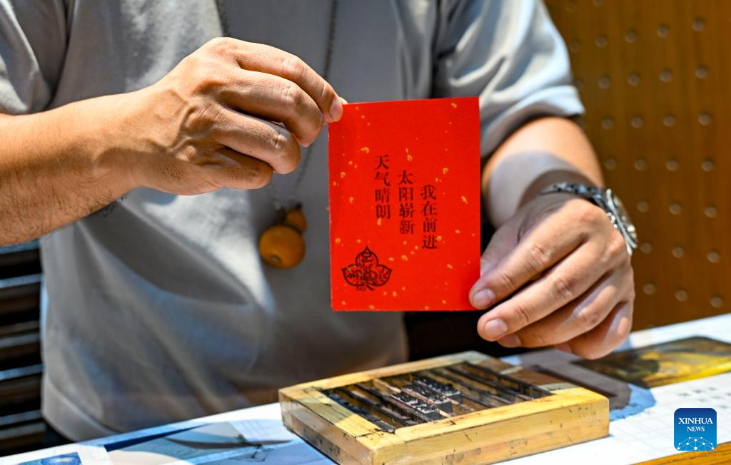 The owner of a movable-type printing shop in the Yongqing Block displays one of his movable-type printing works in Guangzhou, south China's Guangdong Province, May 13, 2025. (Xinhua/Chen Shuo)