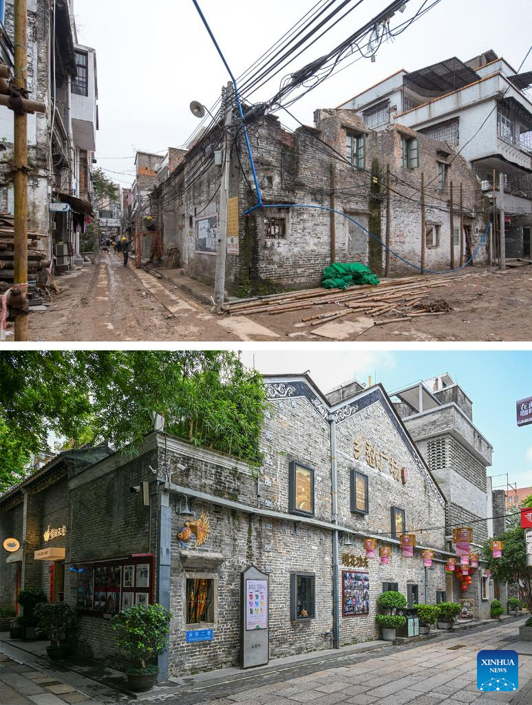 This combo photo shows a street in the Yongqing Block before renovation (above, undated file photo) and after renovation (below, taken by Xinhua photographer Chen Shuo on May 13, 2025) in Guangzhou, south China's Guangdong Province. (Xinhua)