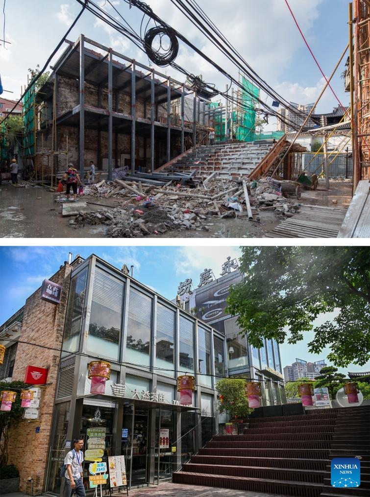 This combo photo shows a square in the Yongqing Block before renovation (above, undated file photo) and after renovation (below, taken by Xinhua photographer Chen Shuo on May 13, 2025) in Guangzhou, south China's Guangdong Province. (Xinhua)