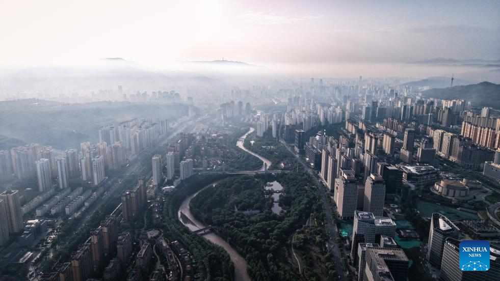 A panoramic aerial drone photo taken on May 22, 2025 shows the sunrise scenery in Xining, northwest China's Qinghai Province. (Xinhua/Qi Zhiyue)