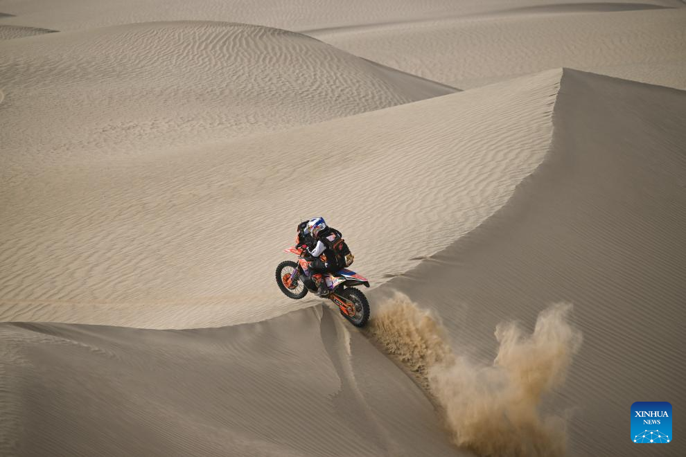 Rider Aizihaier Jiapaer competes during stage 2 of the 2025 Taklimakan Rally in Alaer, northwest China's Xinjiang Uygur Autonomous Region, May 22, 2025. (Xinhua/Hu Huhu)