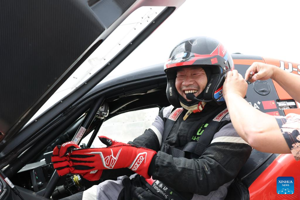Driver Tao Yongming reacts after stage 2 of the 2025 Taklimakan Rally in Alaer, northwest China's Xinjiang Uygur Autonomous Region, May 22, 2025. (Xinhua/Hu Xingyu)